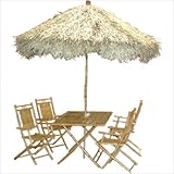 5467 Features: -Set includes dining table, 4 chairs and umbrella. -Bamboo and grass construction. -Eco friendly. -Handmade. Specifications: -Seat height: 19''. -Arm rest height: 26''. -Table dimensions: 30'' H x 35'' W x 53'' D. -Chairs dimensions: 38'' H x 22'' W x 18'' D. -Umbrella dimensions: 96'' H x 108'' W x 108'' D.